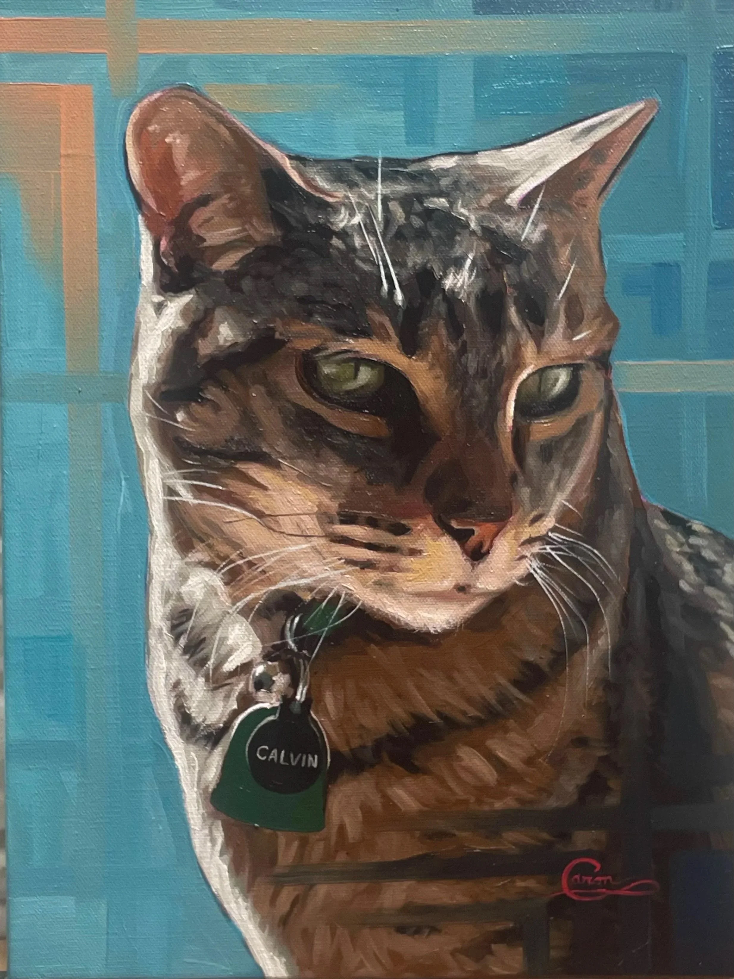 Pet portraits start at $800 and go up from there, depending on size, detail, and how many pets are in the portrait.